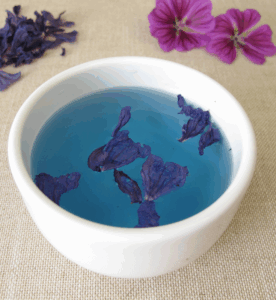 フランスでは「夜明けのハーブティー」という名で親しまれている「マロウブルー」。サファイヤのような透きとおる青、アメジストのような紫、そしてピンクダイヤモンドのような桜色です。どれもすてなスイショク(水色)で、ずーと見ていたい。と思うのですが、この色は長くは持たないのです。だからこそ、その鮮明な色は脳裏に焼きつくのですね、
